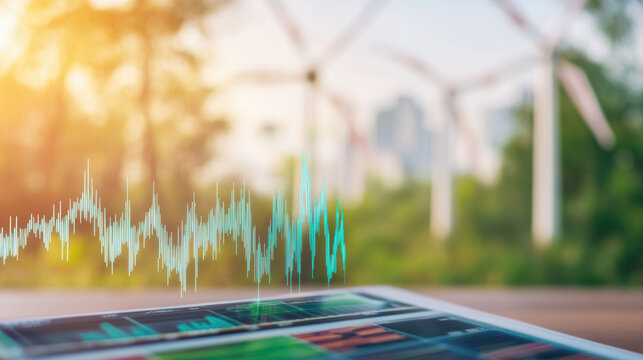 digital tablet displays financial graphs with ESG metrics, set against backdrop of wind turbines, symbolizing sustainable energy and environmental responsibility