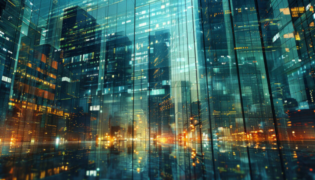 A low angle shot of modern skyscrapers with glass facades reflecting light trails and data visualizations.
