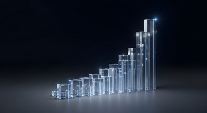 A 3D illustration of a transparent glass bar chart symbolizing business growth, success, and progress. A modern, futuristic design with a glowing light effect on a dark background.