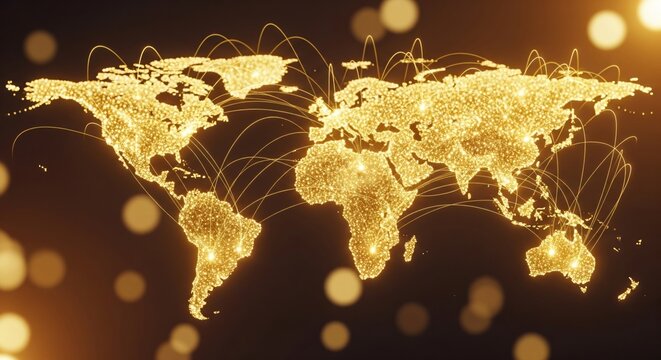 Futuristic digital world map with glowing data networks