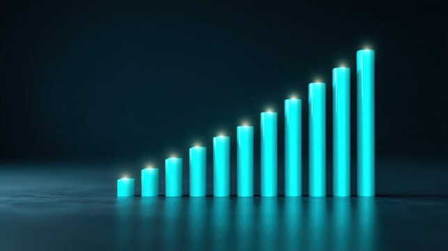 Blue Glowing Bar Graph Displaying Growth Progression on Dark Background for Business and Financial Concepts, Data Analysis, and Performance Metrics