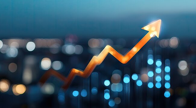 Glowing upward trend graph over a city skyline at night