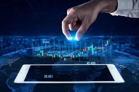 A human hand reaches for a glowing light above a digital screen displaying financial graphs over a global map, symbolizing technology and successful investment strategies. Scalp