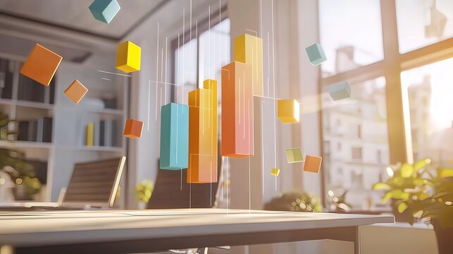 Colorful 3D bar chart hovers over modern office desk, sunlight streams through large window.