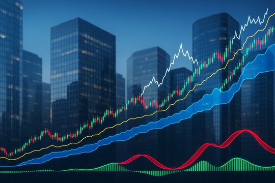 Financial trading data over a city landscape, visualizing market growth and trends. The image showcases financial data overlaying a cityscape.