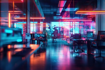 Modern neon cyberpunk open space office interior blurred with information technology overlay. Corporate strategy for finance, operations, marketing. Generative AI technology