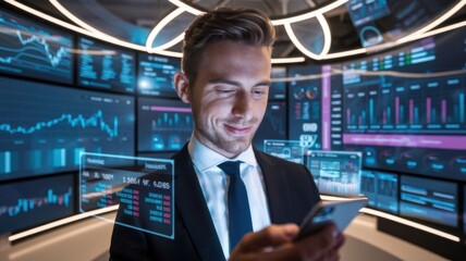 Modern Businessman Using Smartphone with Holographic Financial Data Charts for Real-Time Insights