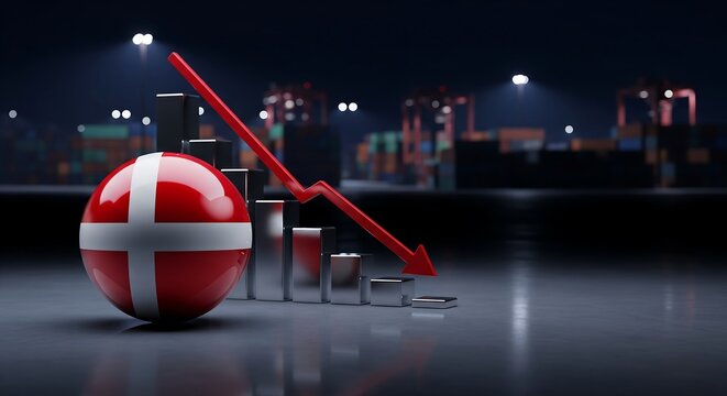 Denmark economy decline graph with red arrow and flag