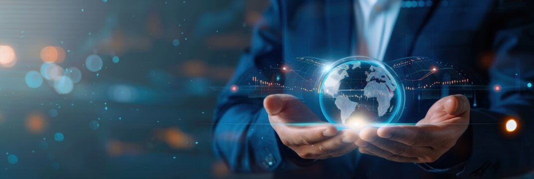 A glowing globe is surrounded by cascading lines and numbers, depicting financial data and market trends.