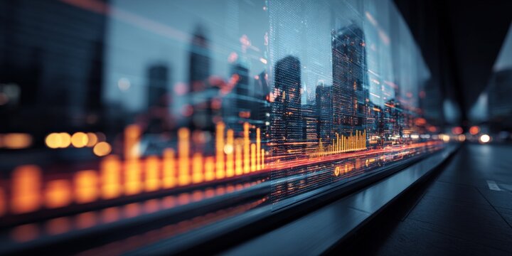 Abstract image depicting financial data overlaid on a blurred cityscape background, suggesting the dynamism of urban markets and global finance