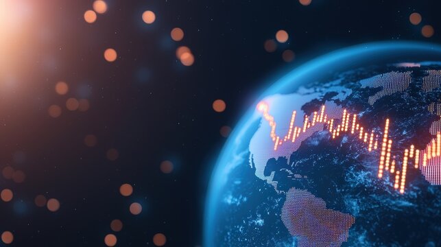Futuristic digital globe and financial data network visualization  Global market statistics overlaid on a vibrant digital grid background
