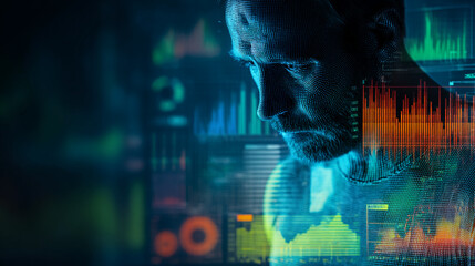 Abstract image of a man's face overlaid with data visualizations, conveying themes of technology, data analysis, and digital transformation