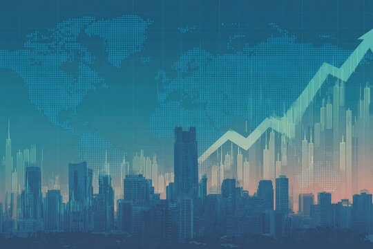 Financial data visualizations overlayed on urban skyline