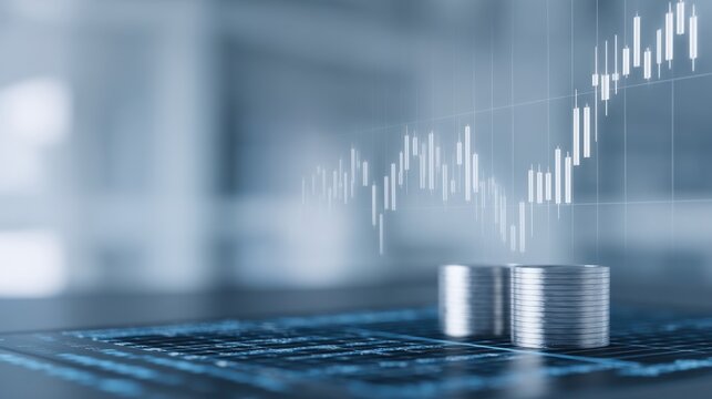 Financial growth concept with coins and digital stock market chart depicting rising trends and investment opportunities in a modern business environment