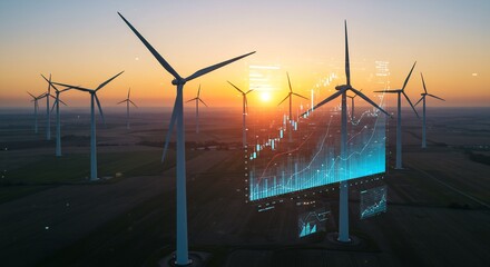 Wind turbines at sunset with financial growth chart overlay and data visualization energy renewable energy