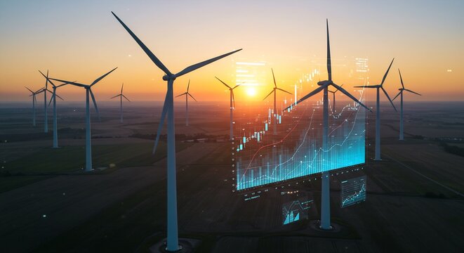 Wind turbines at sunset, overlaid with financial charts and graphs