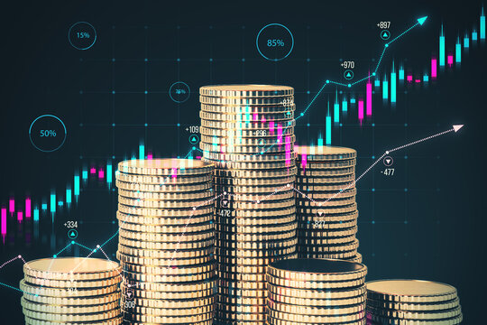 Creative growing forex chart and stacked golden coins on dark background. Trade, growing income and stock concept. Double exposure.