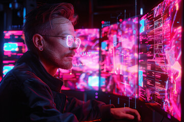 IT expert analyzing complex data sets on multiple monitors in a high-tech workspace, illustrating advanced machine learning development