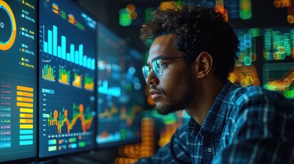 Professional man analyzing data on multiple screens in a modern office, focused on financial graphs and technology.