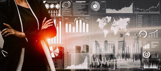 Big Data Technology for Business Finance Analytic Concept. Modern graphic interface shows massive information of business sale report, profit chart and stock market trends analysis on screen monitor.