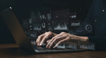 Close up of hands typing on a laptop with glowing digital data visualizations and charts overlayed