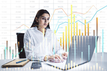 Focused businesswoman analyzing financial graph on laptop