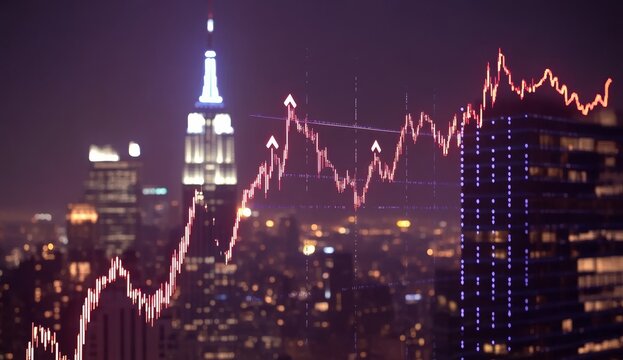 A glowing stock market chart overlayed on a nighttime cityscape with a skyscraper in the background.
