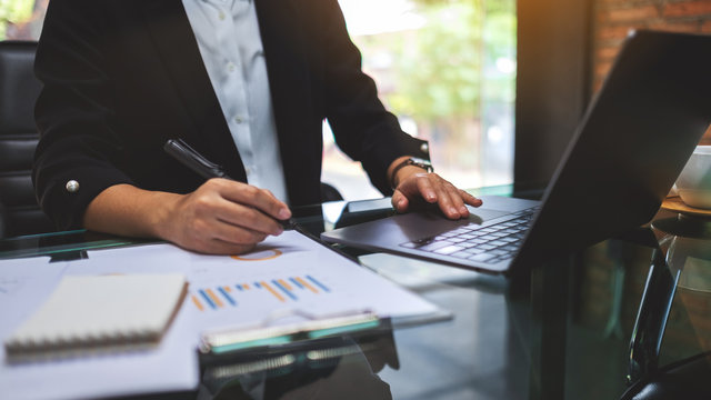 A businesswoman writing and working on business financial data and document with laptop computer on the table in office