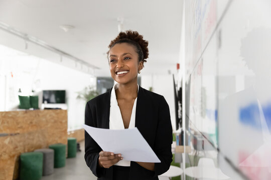 Happy successful African American businesswoman standing at office whiteboard, looking away, smiling, laughing, holding paper financial report, working on project scrum management