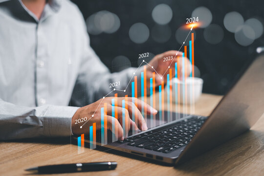 Businessman use laptop and analyzing financial information and calculating financial information for long-term for the development of a sustainable economic plan investments.developed in year 2024