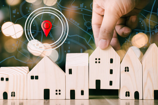 Hand choosing mini wood house model with icon about real estate business. Finding a new home location concept.