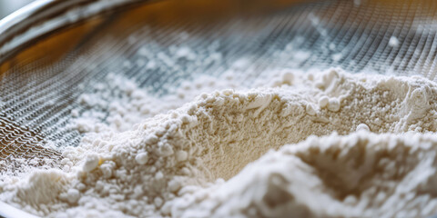 Sifting Flour Through a Fine Mesh Sieve. Close-up of flour being sifted through a metal sieve, capturing the motion of baking preparation.
