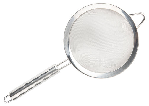 Stainless steel strainer with fine mesh and metal handle isolated on white background