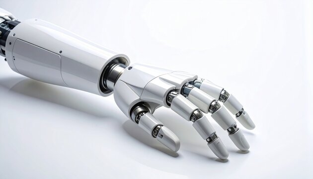 White robotic hand with spread fingers on plain background—sleek articulation and mechanical joints evoke dexterity, futurism, and human-machine synergy in minimalist tech anatomy composition.
