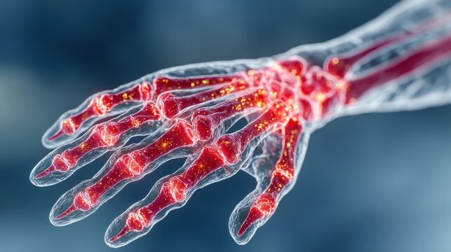 A medical illustration of a human hand with glowing red and white highlights on the bones and joints on a blue background