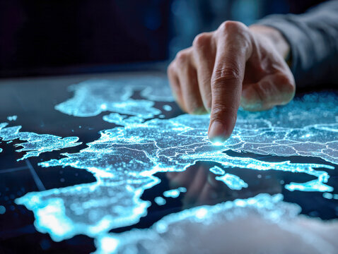 Fingers interact with a glowing digital map on a dark interface