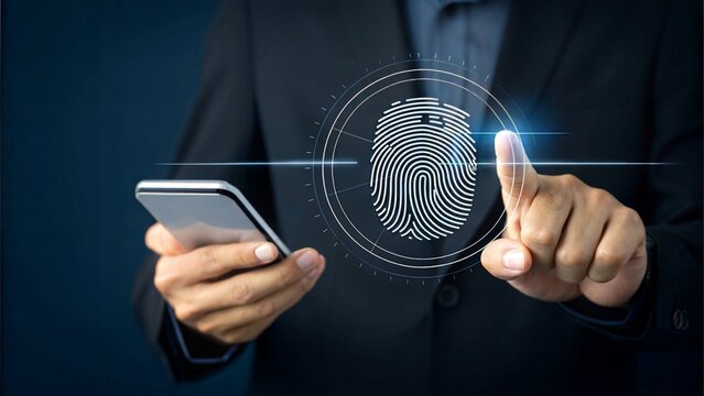 Digital fingerprint scan on high-tech interface for cybersecurity