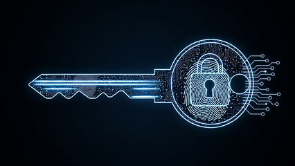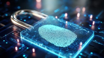High tech digital fingerprint lock with glowing blue circuit board background.