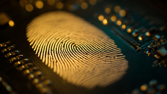 Golden digital fingerprint on futuristic black and yellow circuit board interface.