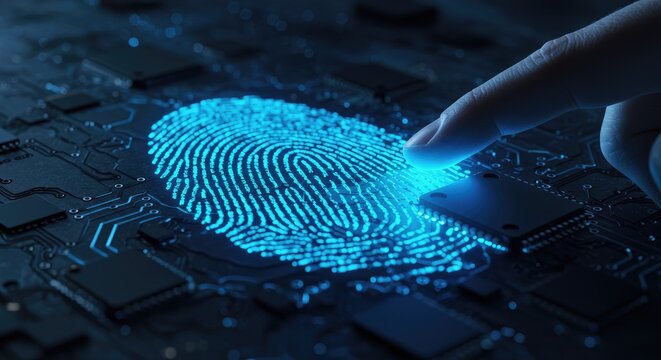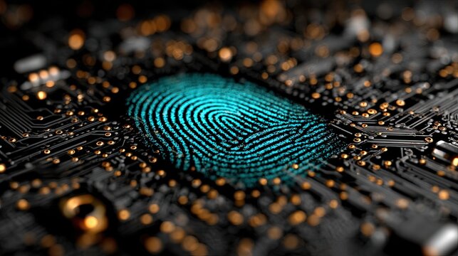 Glowing digital fingerprint on a circuit board, security concept