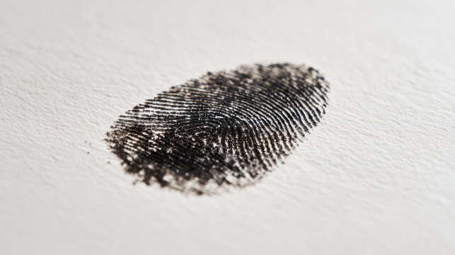 Close-up of fingerprint on white paper, representing security identification. Detailed view of fingerprint impression on textured white surface, highlighting biometric authentication data protection