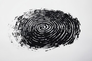 smudged black fingerprint print with concentric spiral ridges on white background conveying mystery and identity
