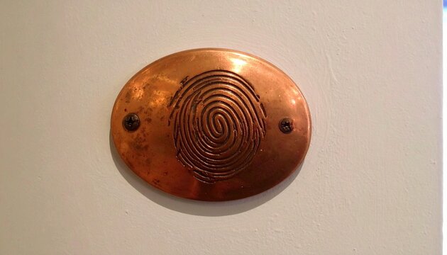 A copper oval plate etched with a detailed fingerprint is mounted on a light wall. Its metallic sheen and biometric motif evoke identity, permanence, and the intimate trace of human presence.