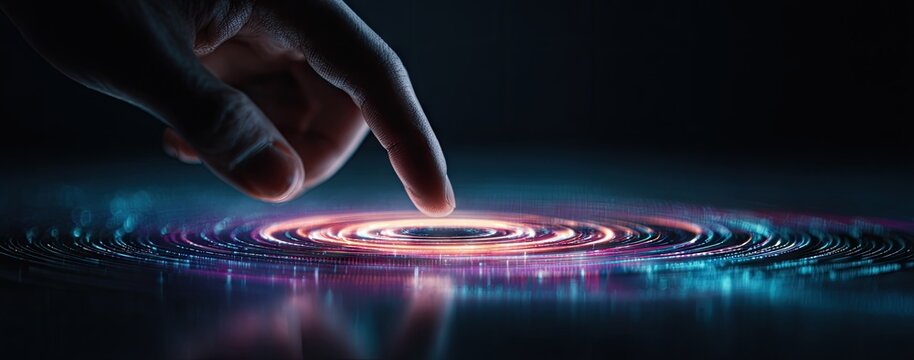 A hand's fingertip interacts with a glowing, ethereal, digital surface.  Light blue ripples radiate outwards from the point of contact