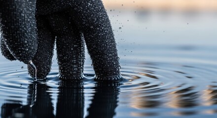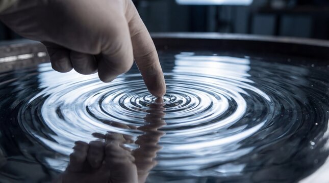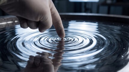 Fingertip touching calm water creating gentle ripples droplets closeup serene reflection
