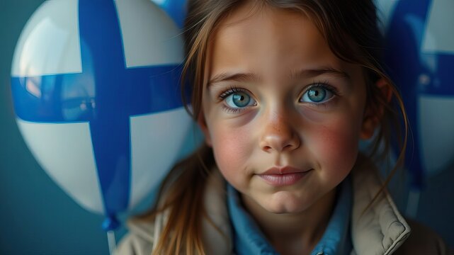 Smiling girl with finnish flag balloons celebrating finland's independence day concept
