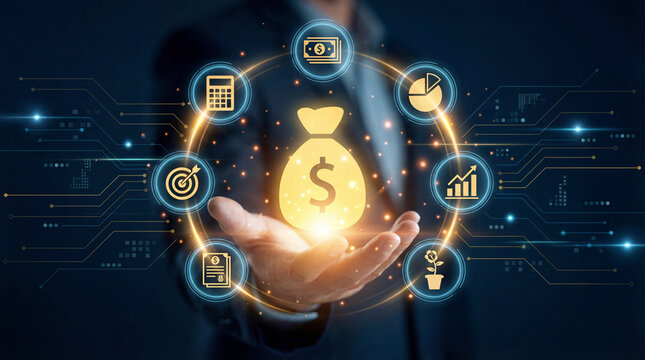 Digital financial growth and investment management concept with glowing money bag icon, business analytics symbols, profit growth, budgeting, savings, fintech technology, and smart wealth strategy vis