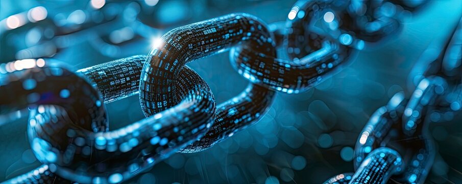 A blue digital chain with an animated digital data stream, symbolizing the interconnected nature of blockchain technology and its impact on financial recording.