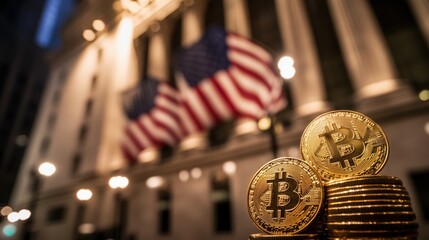 Bitcoin, cryptocurrency investment and financial growth with coins in foreground, Wall Street background, exploring digital assets and market trends in finance.
