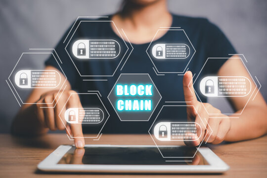 Blockchain technology, Businessman touch blockchain icon on structure global network. Chain of encrypted blocks to secure of business data information of global connected. security binary coded.